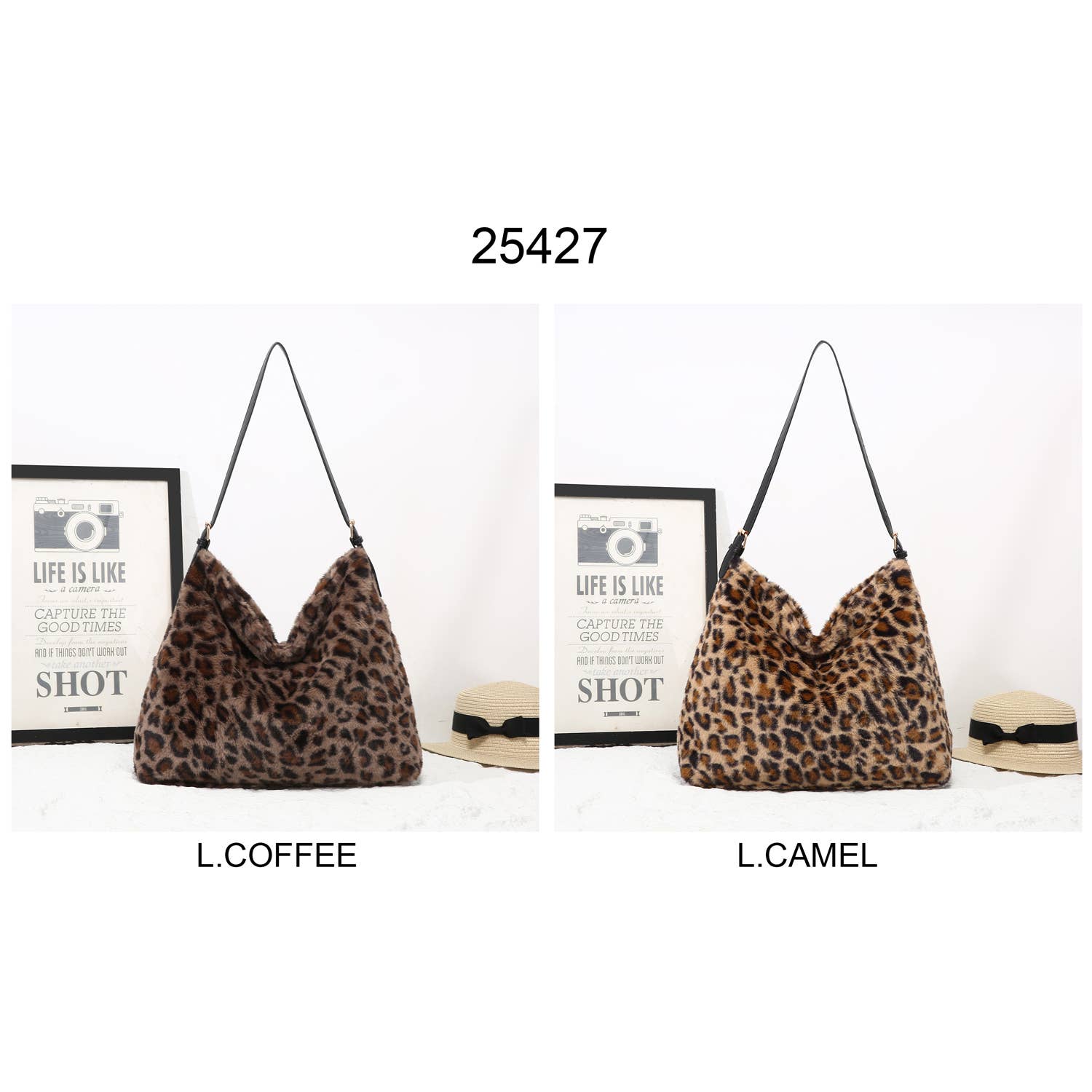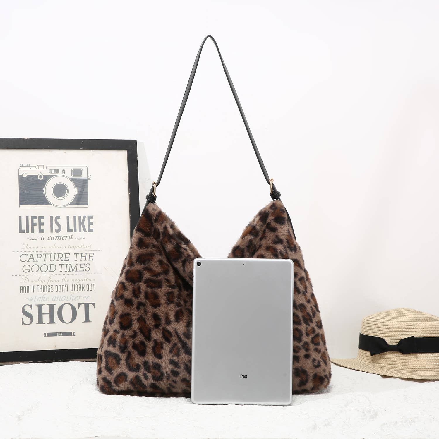 Brown Faux Fur Leopard Print Slouch Bag with zip top and inside pocket