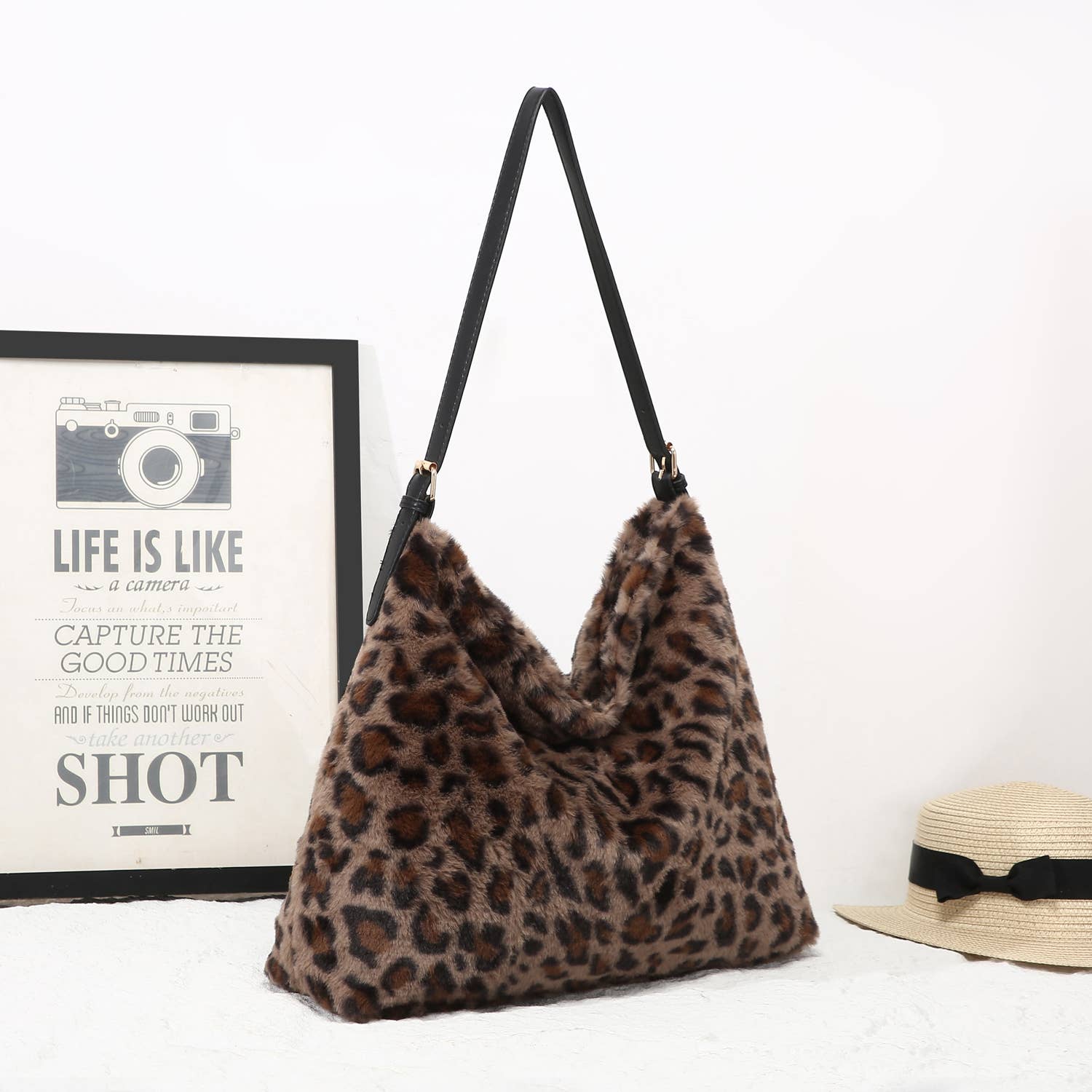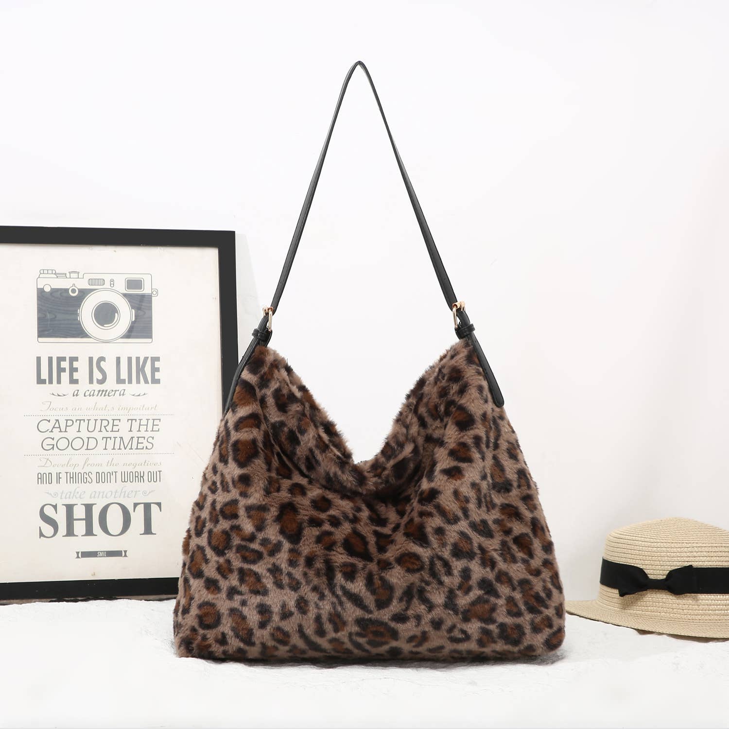 Brown Faux Fur Leopard Print Slouch Bag