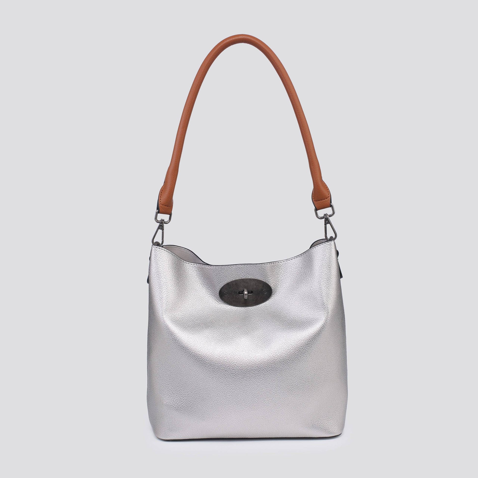 Silver shoulder bag with contrast handle and inside zip .