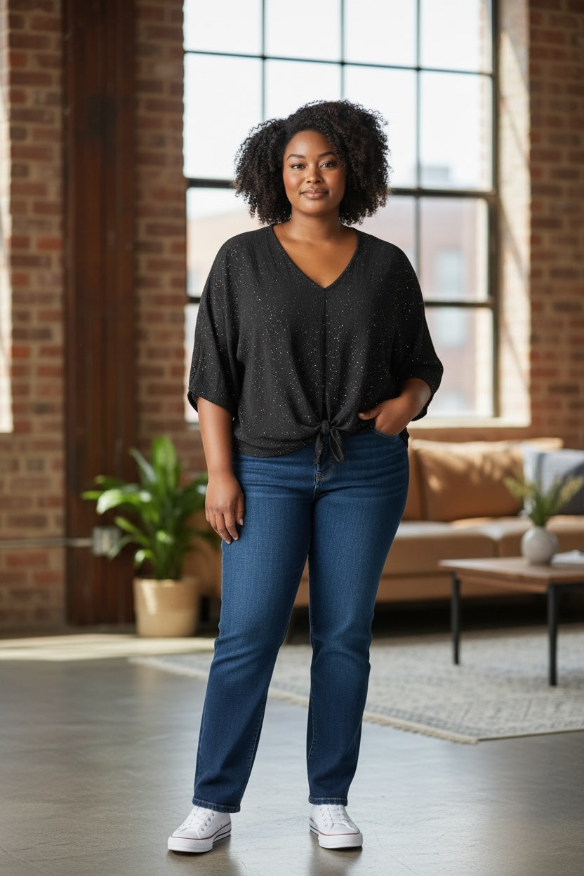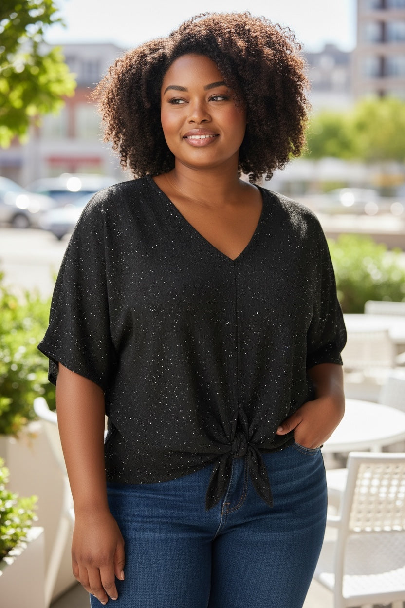 V - neck tshirt style top with tie front detail and scattered silver flecs all over.