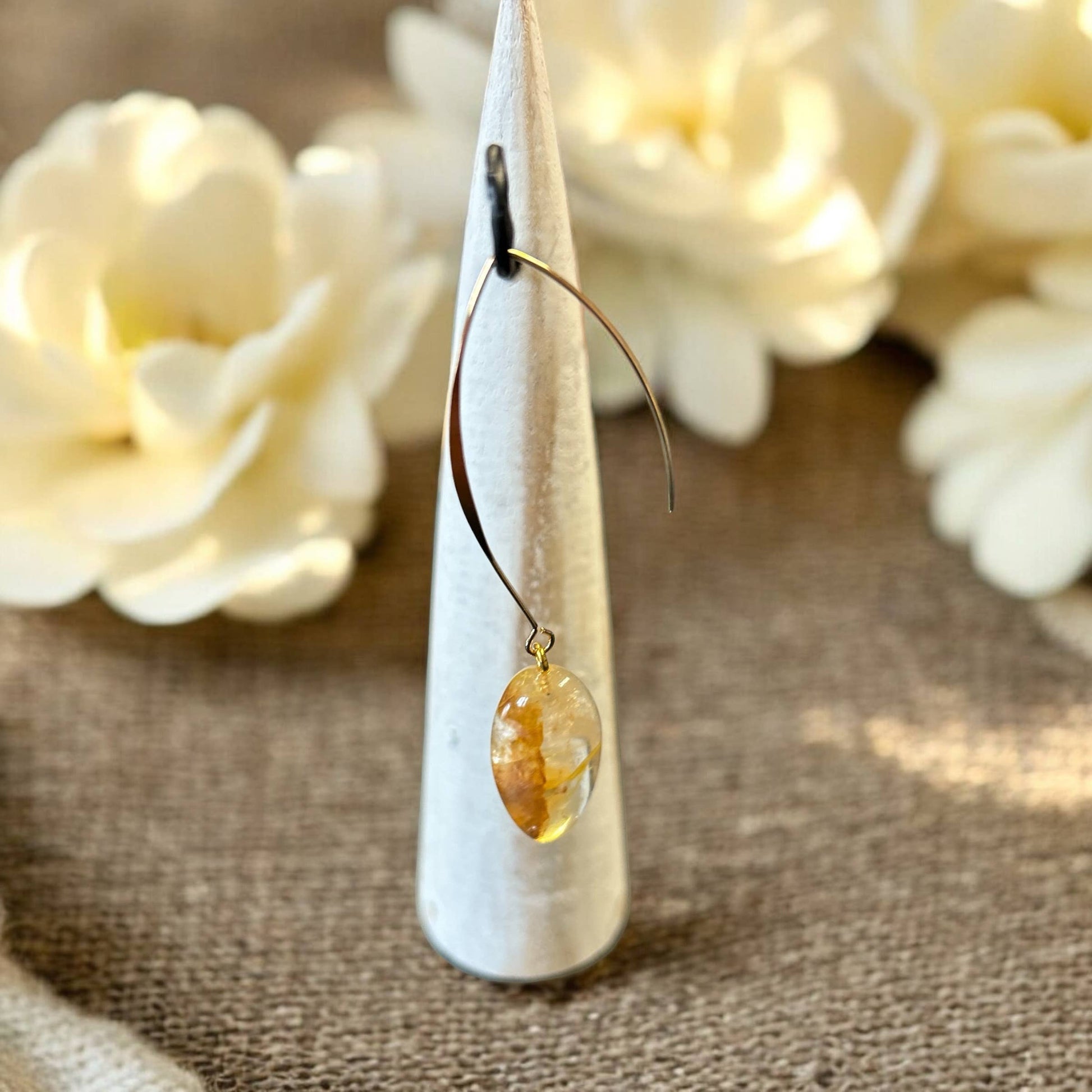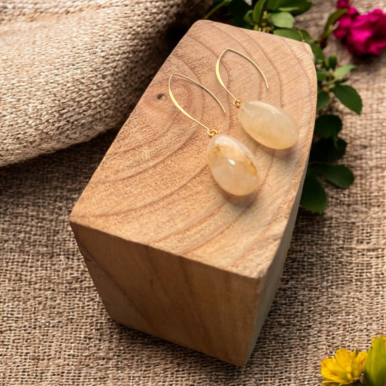 The earrings are long drop style, featuring a prominent, deep sand-coloured stone as the focal point. The stone is oval-cut, with a rich, golden hue, faceted to catch the light from multiple angles.