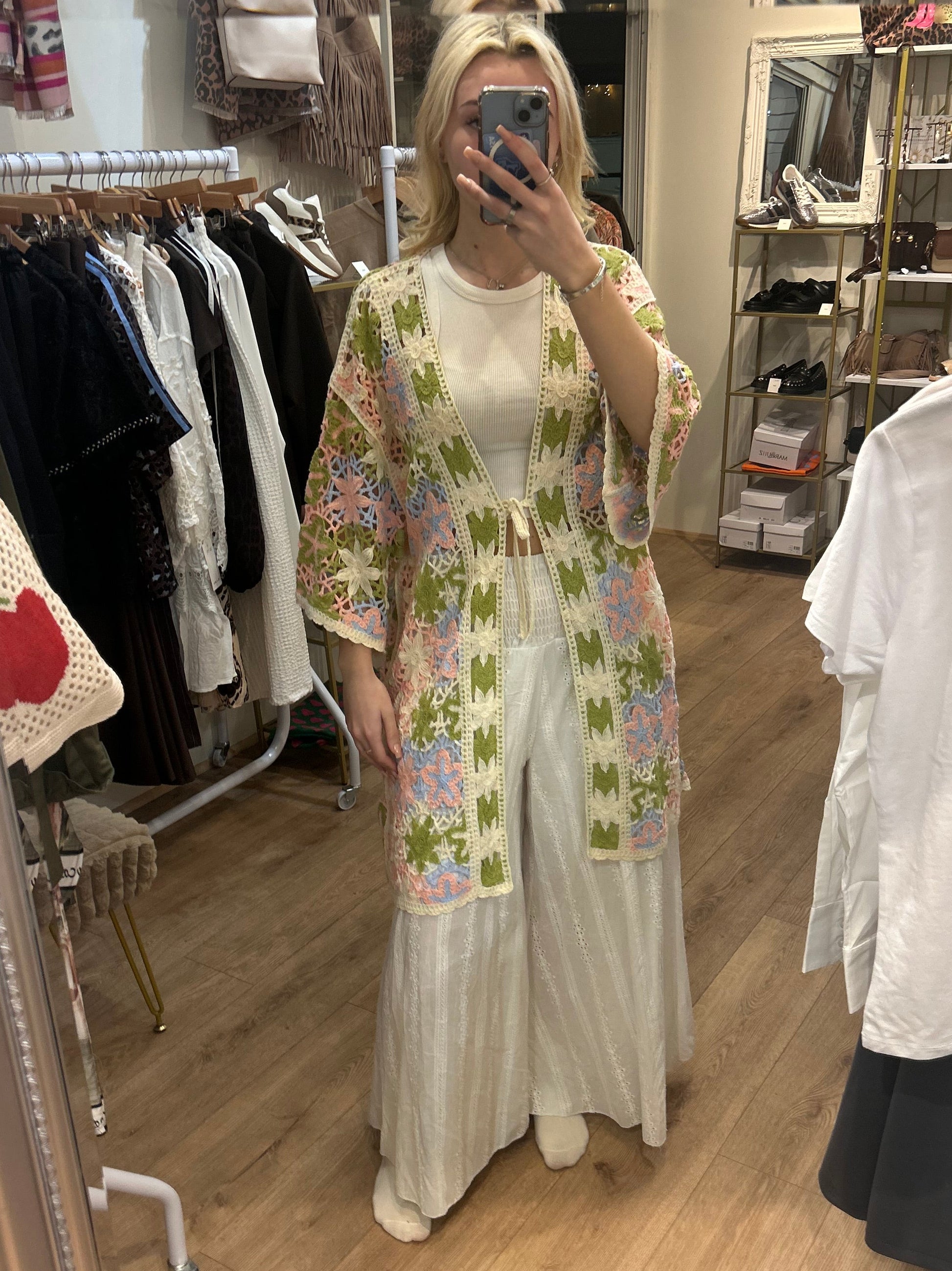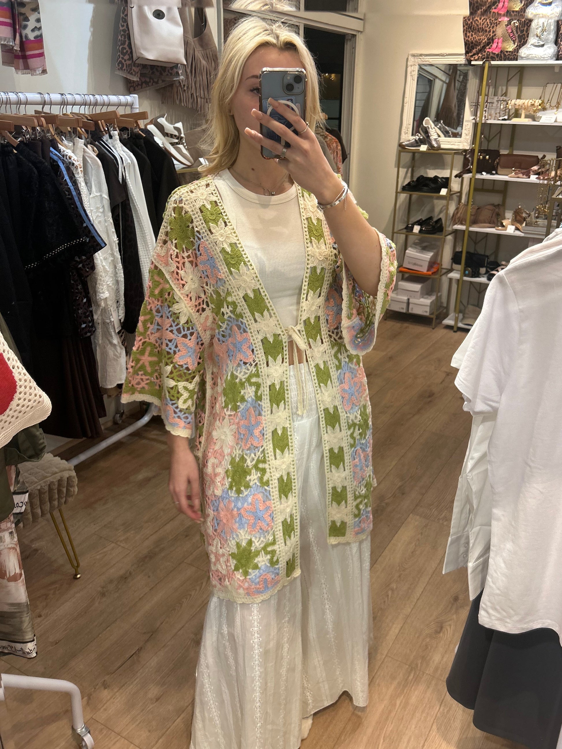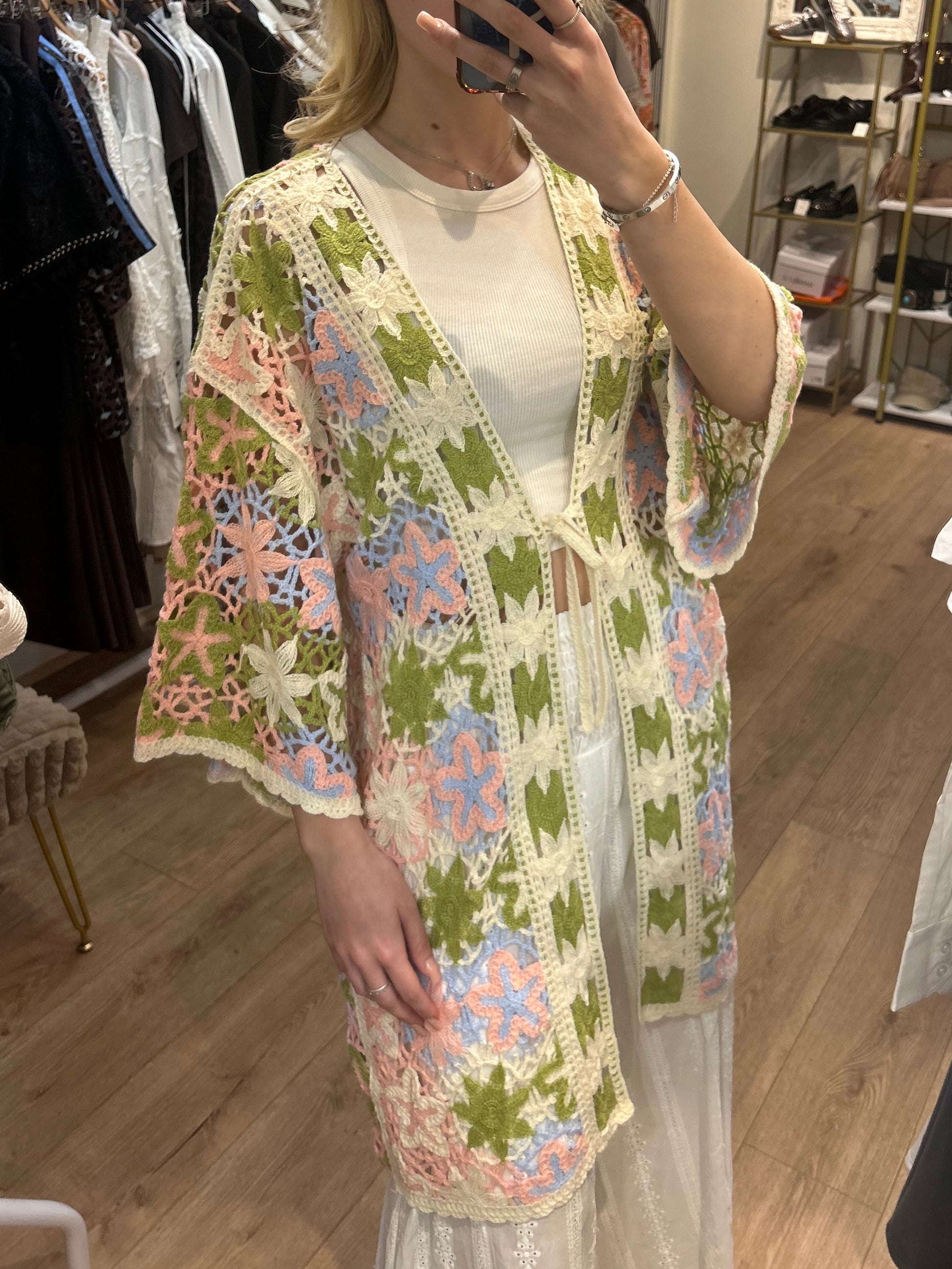 Gorgeous spring colour crochet with lovely flared 3/4 length sleeves and little tie over the chest. Worn with our beautiful embroidery Anglais trousers.